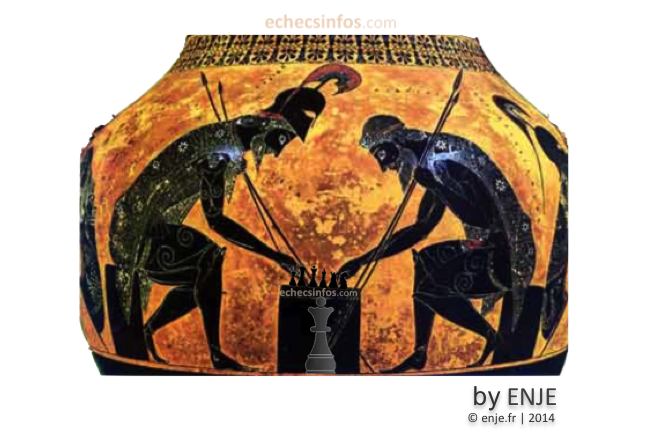 L'Encyclopédie méthodique - Dictionnaire des Jeux Mathématiques (Paris - 1798) nous rappelle que la tragédie "Iphigénie en Tauride" par Euripide (-480 -460 av JC) évoque une partie d'échecs entre Ajax & Protesilaus en présence d'Ulysse (1). Mieux, au VIIIème siècle av JC, Homère dans le premier livre de l'Odyssée, nous dit que dans l'attente du retour d'Ulysse, les nobles et prétendants de Pénélope jouaient aux échecs devant sa porte !