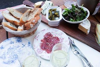 La bouteille arrive, elle est encore un peu fraiche. On la laisse prendre une bonne température et là c’est top, sec mais légèrement fleurie. Je ne sais pas si on peut dire ça d’un vin mais je le trouve rafraichissant. Après avoir trouvé la boisson, on recherche maintenant le bon accompagnement. On regarde autour de nous les différentes planches qui circulent. On tombe d’accord sur la planche de fromages (14 euros) et la saucisse sèche (5 euros).