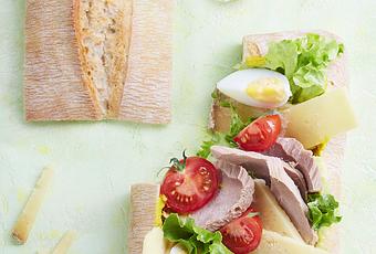 6° Inciser la croûte supérieure du pain près des bords pour former un chapeau. Retirer la mie. Badigeonner l’intérieur du mélange mayonnaise/moutarde puis répartir les feuilles de salade, les œufs, les tomates cocktail, le thon et le Cantal Vieux.