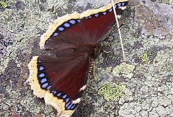 Frappée par sa grande taille et la bordure blanche de ses ailes sombres où je distingue furtivement des points bleus. Bien qu'il se soit posé sur une pierre du chemin, je n'ai pas le temps de le prendre en photo car il s'envole à mon approche et mon appareil photo n'était pas équipé de l'objectif approprié. J'avais repéré l'endroit de la prairie voisine où il s'était à nouveau posé et Lupa a réussi à immortaliser cette rencontre inespérée.