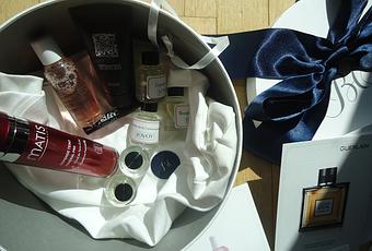 On dénoue ce doux ruban d’un bleu marin, libérant ainsi la boîte de son couvercle et laissant découvrir au sein d’un pochon monogrammé, une sélection de produits de beauté très chics.