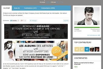 Fin 2007, le chanteur Grégoire s’inscrivait sur My Major Company pour faire financer son album. 3 mois plus tard, son projet atteint les 70 000€ requis. En tout, 347 internautes sont devenus ses producteurs. Ils ont contribué à son projet entre 10 et 6 020€. Avec plus de 1 200 000 exemplaires écoulés, la rémunération de ses producteurs a atteint près de 20 fois leur mise initiale ! Pour en remercier certains, Grégoire a mis en scène une soixantaine de ses producteurs dans le clip de son single Toi+Moi.