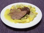 Couper les magrets en tranches. Sur un plat de service, disposer les tranches de canard sur un lit de poireaux et de mangues sautés. Arroser de sauce à la mangue. Servir accompagné de riz.