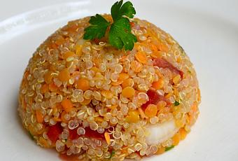 Dans un saladier mélanger les légumes, le quinoa, les lentilles.