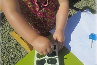 Elle a apprécié de peindre avec les glaçons, mais avant qu'ils ne fondent je lui ai mis dans un bac, un peu d'eau, pour qu'elle puisse voir l'eau changer de couleurs, une fois que tous les glaçons avaient fondu elle était un peu déçu parce que lorqu'elle fait de la peinture elle s'arrête quand elle a envie. Je pense que je retenterai cette façon de peindre mais je remplacerai le colorant par de la peinture pour faire un plus joli dessin et que les couleurs soient plus intenses sur la feuille.