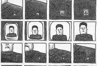 Il montre l'absurdité du système par beaucoup de petites touches : pas d'électricité sauf lorsque des représentants de gouvernements étrangers sont présents, des travailleurs "volontaires" pour peindre la moitié d'un pont, balayer ou couper de l'herbe sur une autoroute, etc. On peut même vous faire visiter le musée de l'impérialisme américain pour vous présenter les massacres qu'ils ont commis ! Le plus hallucinant est certainement le culte du leader. La première chose à faire en arrivant est de déposer des fleurs au pied de sa statue. Le seul musée à visiter est celui des 'cadeaux des pays amis' du leader. Le leader a écrit plus de mille ouvrages et réalisé plusieurs films... Et son peuple meurt de faim. Oui, oui, tout va bien ! Tout en relisant 1984, notre auteur peut expérimenter en temps réel les aberrations d'une dictature féroce. Une BD étonnante, certainement plus que Shenzhen, avec laquelle elle contraste par l'absence même des coréens (Shenzhen était plutôt du genre blindée). On a l'impression de remonter dans le temps lorsque le narrateur visite le métro qui fait abri anti-aérien ou lorsqu'il se déplace à Pyongyang, encadré par ses gardes, euh pardon, guides !