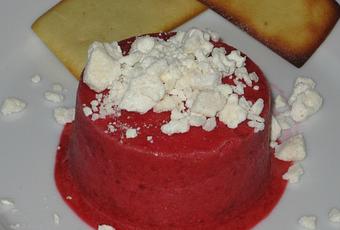 J'ai repris la recette du sorbet framboise (ici) que tout le monde avait tant aimé la dernière fois et j'ai rempli à moitié un empilo-déco tupperware de sorbet, positionné un morceau de meringue au centre et recouvert de sorbet framboise. J'ai mis 4h au congelo, démoulé, parsemé de brisure de meringue et c'était prêt à déguster.