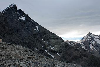 Quelques barres dans les schistes. Un névé tardif à contourner par la gauche. Et on file vers la pyramide finale, et une sacrée pente.