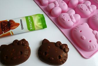 Remuer le chocolat fondu aussitôt sorti du micro-ondes puis répartir la préparation dans les empreintes du moule silicone à chocolats Hello Kitty (moule préalablement posé sur une plaque).