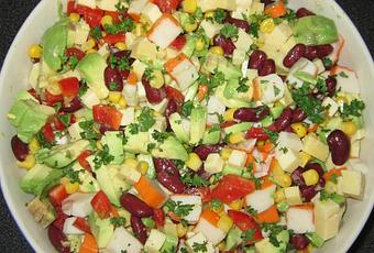 Ajouter le persil, le poivron et le gouda coupé en dés, le surimi en rondelles et les avocats coupés en cubes mouillés de jus de citron.