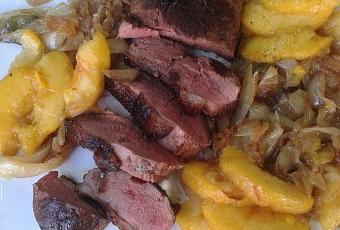 Plancha de canard gras aux pêches et aux poivrons, compotée d’oignons à la pêche