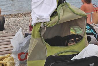 Encore une histoire de 4 pattes. Quelle est la motivation de ce chien qui se cache dans un petit sac transportable ? Ce-jour-là (samedi 9 août) la météo était propice à la baignade mais le soleil était aux abonnés absents aux Bains des Pâquis lieu de la prise de vue comme ailleurs d’ailleurs. Il a l’air craintif et apeuré, on dirait que c’est sa première sortie à moins que c’est un jeu de cache-cache où il fait le cabot pour attirer l’attention de celui et ou de celle qui voudrait bien s’en occuper. Et s’il prenait juste la pose pour le photographe de transit que je suis ?