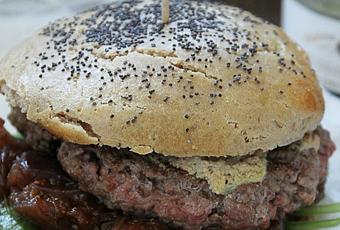 - Sur la tranche du bas disposer un lit de roquette puis une bonne cuillère à soupe de compotée d'oignons aux figues. Déposer le steak.
