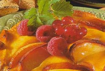 Ébouillantez et pelez les pêches, coupez-les en quartiers. Enfoncez-les à peine dans la crème.