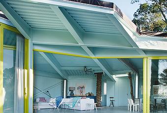 Difficile de deviner que cette cabane (qui est en fait composé de plusieurs éléments), ressemblant à un container qui aurait explosé comme un pop-corn, est en fait construite sur pilotis (couleur lavande !)… Côté rue, peu ou presque pas d’ouvertures, côté mer, tout est grand ouvert sur la forêt de pins… et la piscine à débordement. Le jaune fluo des encadements est calmé, adoucit, par la couleur dominante de l’habitation, un bleu pastel frais, reposant, se confondant presqu’avec le ciel… Pour agrandir l’espace intérieur, rien de tel que d’utiliser le même revêtement à l’intérieur comme à l’extérieur, et une ouverture totale.