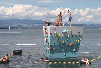 Jusqu’au 12 septembre 2014 un “Psychobloc” aux Bains des Pâquis fait le bonheur des nageurs et autres grimpeurs et plongeurs. Excellente initiative et une première suisse sur l’eau pour cette structure qui demande une certaine adresse à ceux et celles qui veulent se hisser sur son toit pour mieux plonger. Je n’ai pas hésité à mémoriser ce plongeoir spécial qui agrémente les lieux et donne une autre valeur ajoutée aux très convivial Bains des Pâquis.