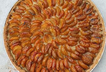 Saupoudrez le fond de tarte de poudre d'amande, puis disposez les mirabelles harmonieusement par dessus.