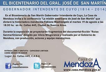 La Casa de Mendoza, bureau de représentation officielle et institutionnelle de la Province de Mendoza à Buenos Aires, accueillera deux conférences dans le cadre des célébrations du bicentenaire du gouvernorat de José de San Martín, dont j'ai déjà eu l'occasion de vous dire combien il a marqué de son empreinte toute l'ancienne Province de Cuyo et tout particulièrement la ville de Mendoza où il a vécu presque quatre ans en trois périodes distinctes (de 1814 à 1816, puis presque toute l'année 1819 et une bonne partie de 1823, jusque plusieurs mois après le décès de son épouse).