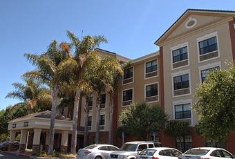 Notre hôtel à Union CityHeureusement, après une première nuit courte mais réparatrice, nous découvrons enfin le ciel bleu et les palmiers. Le climat local, lui, n'est pas qu'une légende Hollywoodienne ! Nous sommes dans un hôtel Extended Stay America, qui nous permet d'avoir l'équivalent d'un petit studio avec coin cuisine et équipements pour le prix d'un hôtel classique (voire moins cher car du coup le ménage n'est pas fait tous les jours, et le petit déj non préparé par l'hôtel). C'est parfait pour des séjours de longue durée comme le nôtre !