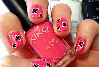 A la base, c'est censé être des petites fleurs mais finalement je ne sais pas trop à quoi ça ressemble... Je trouve ça vraiment très sympa donc c'est le principal ! J'ai utilisé une base bien rose de chez Kiko car avec le noir et le blanc des fleurs, il me fallait une couleur bien girly et très colorée pour la saison !