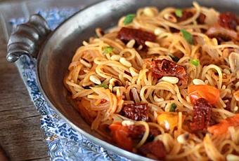 Dans une sauteuse ou une casserole, versez les spaghettis, les tomates cerises, l’oignon, les gousses d’ail, les tomates séchées, le basilic, le pesto rosso et versez enfin l’eau avec le cube bouillon.