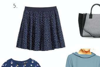 5. Jupe plissée H&M – 14,99 € 6. Cabas bi-matière Pimkie – 25,99 € 7. Robe Zara – 29,95 € 8. Tee-shirt col cheminée Asos – 40 €