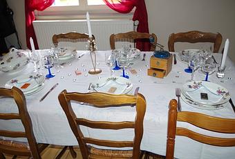Je l'ai faite à "l'ancienne", j'ai utilisé le vieux service à vaisselle de ma grand-mère, un vieux moulin à café quand à la nappe et les serviettes elles étaient de ma belle-maman.