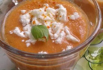 Une soupe d’été rafraîchissante et fruitée, ultra rapide à faire au retour de la plage ou du marché. Il vous faut seulement quelques tomates bien mûres et un melon, ajoutez un peu de feta émiettée et une chiffonnade de basilic frais et passez à table !