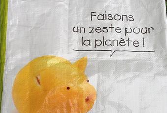 Aujourd'hui, un sac Carrefour . J'ai admiré dans cette légende le jeu de mots zeste / geste mais aussi le jeu qu'on peut imaginer citron / cochon...