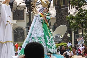 - Ecoute, nous, on est juste venues accompagner les musiciens, alors on va se faire discrètes, hein..." Tolérance zéro pour les religions ancestrales, qui, pourtant, occupaient le terrain depuis bien plus longtemps que Solari et sa clique. Urkupiña, c'était depuis des temps ancestraux un lieu de vénération de la Pachamama, la terre mère. Ensuite, soit-disant, la Vierge Marie est apparue à une bergère (comme souvent). Et la folie a commencé. Aujourd'hui, c'est une guerre de territoire entre la religion catholique qui perd des fidèles et les religions andines qui connaissent un renouveau sans précédent. Opprimées pendant des siècles, elles refont surface et s'affirment en plein jour.L'institution catholique, quant à elle, est toujours dans la même problématique de tentative vaine de conversion des âmes indigènes. L'évangélisation, encore au XXIème siècle et peut-être plus que jamais, est un échec. La religion catholique en tant qu'institution est en crise. Il faut dire que dans un monde économiquement en ruines, l'étalage de richesses, les étoles brodées de fils d'or ne séduisent plus. Les fidèles adorent la Vierge, mais rares sont ceux qui s'agenouillent encore devant les prélats pour leur baiser leur main blanche couverte de bijoux. Certes, on vient à Urkupiña pour prier la "mamita", mais également pour honorer la Pachamama. Tito Solari a beau se prendre pour Jésus, l'époque des gourous est révolue.
