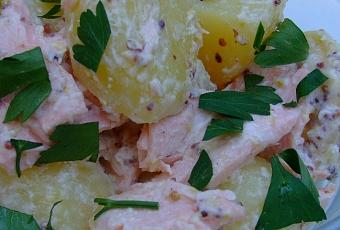Égoutter les pommes de terre, et verser dessus la sauce alors qu’elles sont encore chaudes pour qu’elles soient bien imprégnées. Ajouter le saumon, quelques brins de persil ciselé. Goûter et rectifier l’assaisonnement en sel si besoin.