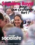Sur l’arrière plan, d’où émergent d’autres fantomatiques figures (dont deux paraissent hors d’échelle) s’inscrit en rose soutenu avec une approche (espace inter-lettres) négative : “Ségolène Royal” dans une composition centrée, puis en oblique, en noir et en bas de casse : “pour que ça change fort !” décentré sur la droite.