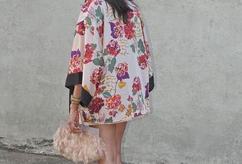 Je porte une jupe, un t-shirt et des sandales Zara, un kimono H&M et une pochette Asos.