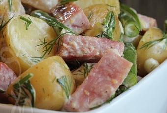 4)Déposer les pommes de terre, les haricots et l’aneth dans un grand bol. Ajouter les bâtonnets de jambon et réserver.
