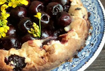 Préparer la garniture à la crème sûre en combinant la crème sûre, le zeste d'1/2 citron, et 2 cuill. à table de sucre dans un bol. Réserver au frais. ''Montage'' et cuissonPréchauffer le four à 450 F. Recouvrir une plaque à pâtisserie de papier parchemin ou d'un tapis en silicone. Placer la pâte sur une planche préalablement enfarinée puis, à l'aide d'un rouleau enfariné, abaisser en un cercle d'environ 25 cm (10 po). Placer des cerises en cercle à environ 1 cm (1/2 po) du rebord de la pâte puis replier les rebords de pâte sur les cerises. (voir photo ci dessous). À l'aide d'une fourchette, faire des trous sur la base de la pâte. Badigeonner les bords de la pâte de lait à l'aide d'un pinceau.