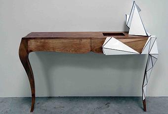 Un joli discours, pour une console d’intérieur en bois aux deux visages, un meuble traditionnel Louis XV à nu sur lequel un jeu de facettes textiles viennent s’appliquer telle une excroissance futuriste venant dissimuler un espace de rangement.