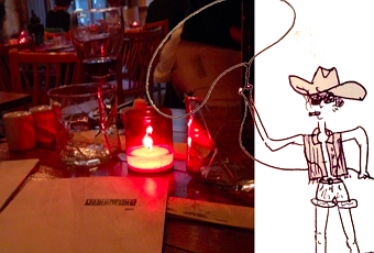 "Il" arrive, et me permet ainsi de laisser tomber mon habit de pauvre rencardée éconduite. Yeah ! On va pouvoir commander de quoi éponger ce rouge. Et ouvrir la bouteille, accessoirement.