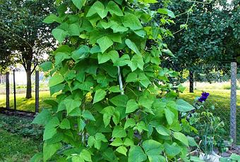 Ce sont des haricots à rames, qui (comme les autres haricots) se sèment de mai à mi-juin et qui peuvent grimper jusqu'à 4 m de haut. Comme vous le voyez mes perches ne faisant que 3 m, ils ont commencé à pousser dans le prunier.