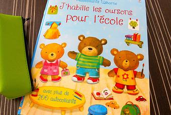 Paru en Août 201416 pages 4,95 eurosLoisir Jeunesse dès 3 ansThèmes : Ecole, Autocollants, OursonsPour les enfants qui aiment habiller leurs ours en peluche, voici quatre charmants oursons Zazie, Oscar, Rosie et Benjamin qu'il va falloir préparer pour l'école. Avec 200 autocollants aux formes simples, il sera facile de repérer, de décoller et d'identifier où ils doivent être placés. Le thème est parfait en ce moment (fin août les jours défilent, la rentrée se profile à grands pas) et permettra aux enfants de découvrir leur prochain environnement.