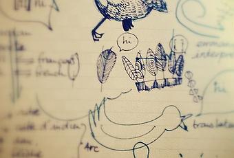 Un interprète de conférence doit se fondre dans la société qu'il représente et être réactif, d'une idée d'oiseau "bavard", je suis passée par le caméléon "discret"...Finalement, le résultat est tout autre ; la parole et le dialogue, tout simplement.