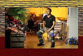 Une chaise virtuelle, baptisée Chairless Chair, permet de se reposer les jambes tout en travaillant. L’utilisateur peut marcher ou courir librement, mais dès qu’il en a besoin, il peut se faire porter par un exosquelette à amortisseur, qui s’adapte à n’importe quelle posture naturelle grâce à des moteurs électriques.