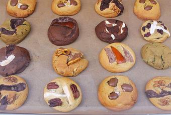 Si le choix proposé ne vous suffit pas, vous pouvez commander votre propre cookie, en choisissant le type de pâte (au chocolat ou à la vanille), les garnitures (chocolats, noix, fruits secs ou confits, …) et la dimension (allant de 100 à 2400 g pour les cookies géants pour 20 personnes). Vous pouvez aussi opter pour un cookie en forme de cœur, à partager en amoureux. J’ai gouté un cookie classique, le « Back to Basics » (trois chocolats Valrhona : blanc, au lait et noir).