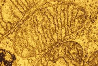 Image en microscopie électronique de trois mitochondries d’une cellule de foie en culture. Les mitochondries jouent un rôle essentiel dans les réactions qui permettent à nos cellules de produire, à partir de l’oxygène, l’énergie qui nous est indispensable, sous la forme de molécules d’ATP (adénosine triphosphate).