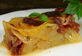 Enfourner à 180°C , pendant 1h, jusqu'à ce que le dessus soit bien doré et les pommes de terre fondantes.