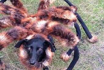 Un chien déguisé en araignée géante (caméra cache)