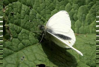 La Piéride de la rave, Pieris rapae (Linnaeus, 1758), est probablement le papillon blanc le plus répandu, et également l'un des papillons de jour les plus communs. L'espèce est toutefois plutôt compliquée à différencier des autres piérides. Sa petite taille (environ 4 cm d'envergure), l'aspect uniforme de la face inférieures des ailes (sans marbrures ni nervures foncées) et la marge noire très discrète des ailes antérieures permettent de l'identifier. Les femelles sont plus marquées (marge noire plus étendue et deux points noirs sur les ailes antérieures) que les mâles (Cliquez sur la photo pour agrandir).