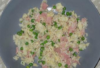 Dans une poèle, mettre le riz, les petits pois, le jambon coupé en petits carrés, les oeufs, la vinaigre et la sauce soja. Mélanger le tout (les oeufs vont cuire dans le mélange).