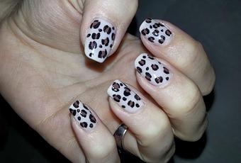 1) Appliquez une base beige en deux couches 2) Appliquez ensuite aléatoirement avec le pinceau du vernis "des tâches" au vernis marron3) Ensuite avec un pinceau de détail et de l'acrylique noir : réalisez des "parenthèses" sur chaque tâches4) Habillez de quelques points noirs et le tour est joué.