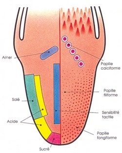 La langue permet de détecter les 4 saveurs principales grâce aux papilles gustatives :