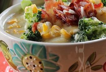 2)À l'aide d'un presse-purée, écraser environ la moitié des pommes de terre. Ajouter le reste du bouillon, le maïs et le brocoli et laisser mijoter pendant environ 6 minutes ou jusqu'à ce que le brocoli et le maïs soient tendres. Réduire à feu doux, ajouter le lait, le sel et le poivre et réchauffer (ne pas faire bouillir).
